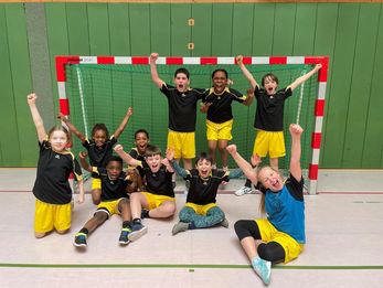 Am 27.02.2024 fanden die Handball Stadtmeisterschaften der Oberhausener Grundschulen statt. Insgesamt traten 10 Grundschulteams gegeneinander auf einem Kleinfeld an. Auch WIR, die Falkensteinschule, waren mit 10 hochmotivierten Handballerinnen und Handballern am Start. Bereits an den Trainingstagen waren die Kinder sehr aufgeregt und konnten ihren Schulwettkampf kaum abwarten. Mit zahlreichen Unterstützern und etwas Nervennahrung im Gepäck traten wir voller Vorfreude und Nervosität unser erstes Handballspiel an. Immer vier Kinder und eine Torhüterin waren gleichzeitig auf dem Feld. Alle Kinder jubelten und klatschen sich gegenseitig ab, als unser erstes Tor fiel. Jeder und Jede wollte unbedingt durchspielen und alles für unsere Schule geben. In vier Vorrundenspielen und einem Platzierungsspiel zeigten wir, was wir können. Die Kinder feuerten sich an und lobten sich gegenseitig für ihre tolle Leistung auf dem Feld. Alle Beteiligten fühlten Spannung pur. Im Platzierungsspiel fiel gleich ein Tor nach dem anderen für die Falkensteinschule. Mit einem 6:0 Sieg und dem Abpfiff des Schiris stürmten die jungen Falkensteinschülerinnen und –schüler das Feld, lagen sich in den Armen und sprangen gemeinsam fröhlich umher. Am Ende haben wir den 9. Platz belegt und können voller Stolz sagen, dass ein wahrer Teamgeist mehr wert ist als jeder Sieg – durch diesen Teamgeist war es für alle Beteiligten ein spannendes und tolles Erlebnis.